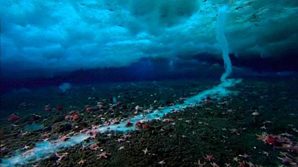 Sonunda denizin dibine kadar ulaşan buzul sarkıtı, burada da yayılmaya devam ediyor, etrafındaki tüm deniz yıldızlarını ve deniz kestanelerini dondurarak öldürüyor.