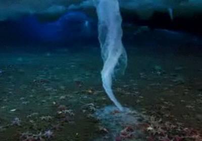 Oldukça ilginç olan görüntülerde suyun altına doğru uzanan bir "ölüm sarkıtı" etrafındaki suyu dondurarak deniz yüzeyinden, derinlere doğru ilerliyor.