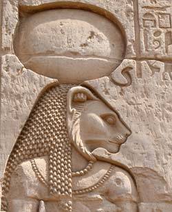 Aslan başlı bir kadın olarak tasvir edilen Sekhmet, savaş tanrıçası olup, aynı zamanda iyileştirici gücü de vardır. Tıp tanrıçası olarak da kabul edilir.