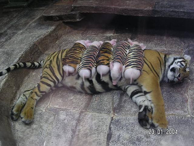 minik domuzcuklarmış. Onlara kaplan derileri giydirerek anne kaplanın yanına koymuşlar.
