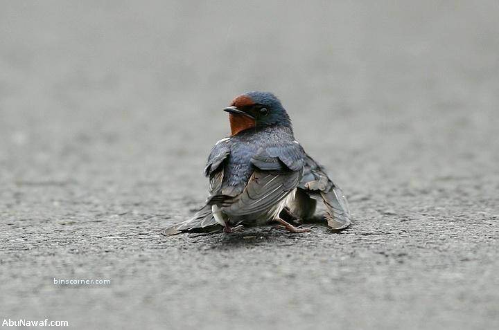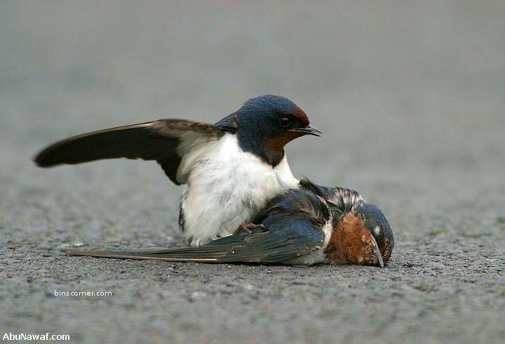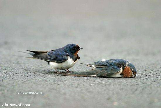 Bu kırlangıcın "eşi" yolda yaralı bir şekilde yatıyor ve ölmek üzere. Yolu geçerken alçak uçtuğu için araba çarpması sonucu yolun bir kenarına savrulmuş.