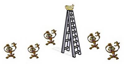 Sonra en baştaki ıslanan maymunların dördüncü ve beşincisi de yenileriyle değiştirilir. Ama tepelerinde o bir kangal muz hala asılı olduğu halde artık hiçbiri merdivene yaklaşmamaktadır.