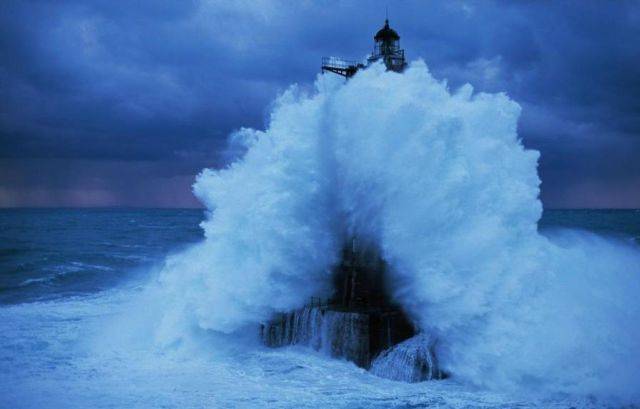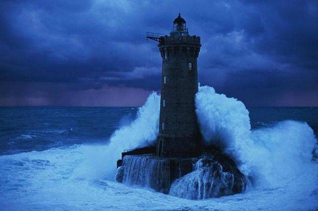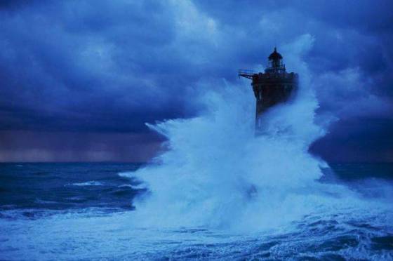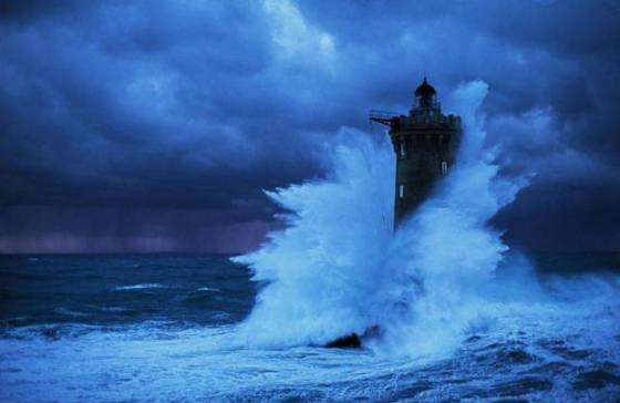 Fransa'da fırtına sırasında dalgalara göğüs geren bir deniz feneri...