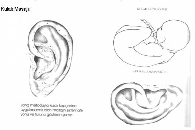 Kulak ceninin ana rahmindeki duruşunun şematik olarak aynısıdır. Ve tüm akupunktur noktaları kulak üzerinde bu esasa göre yer almıştır. Şimdii... başınız, boynununz, beliniz, sırtınız, bacaklarınız, kalçanız, ayaklarınız, omzunuz ağrıdığında yapacağınız tek şey kulaklarınıza masaj yapmak. Kulağınızı baş ve işaret parmaklarınızın arsına alarak kulak kepçesinden başlayarak, dayanabildiğiniz kadar güçlü ve sıkarak masaj yapın.