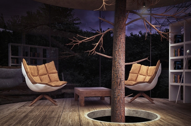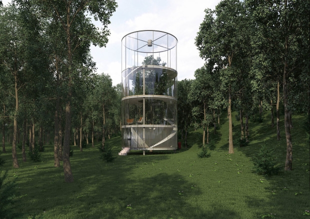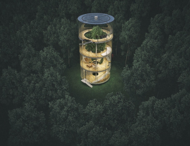 Bir ağacın etrafına inşa ettiği bu camdan tüp ev tasarımı, şehrin karmaşasına ve apartmanların basıklığına alternatif bir yaşam alanı sunuyor.
