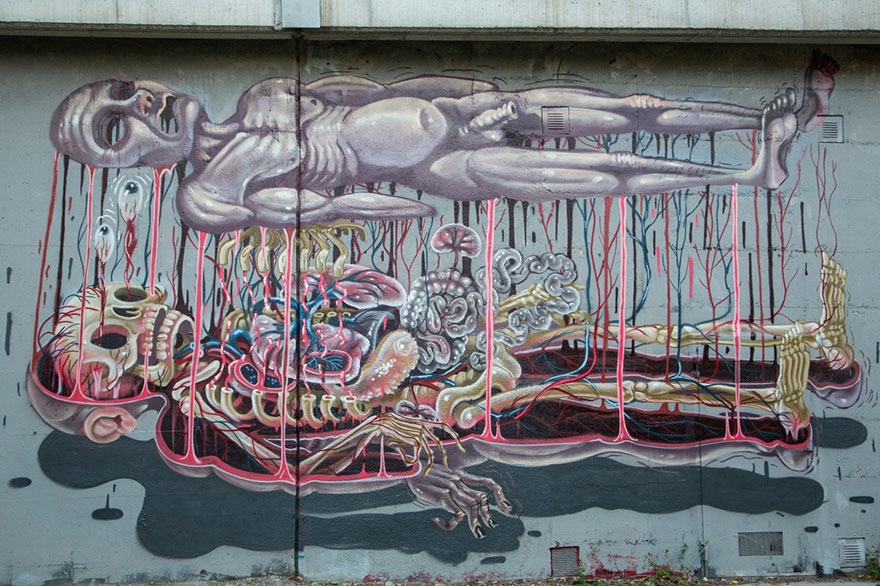 İşte Viyanalı sokak sanatçısı Nychos, anatomiye olan ilgisini sanatıyla birleştirerek, sokak duvarlarına yansıtıyor.