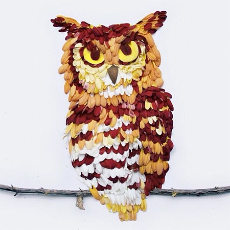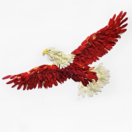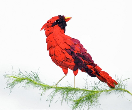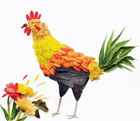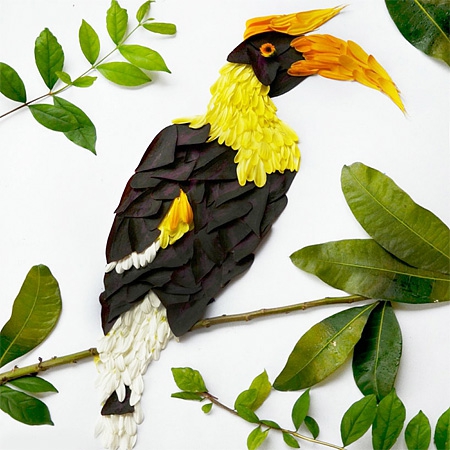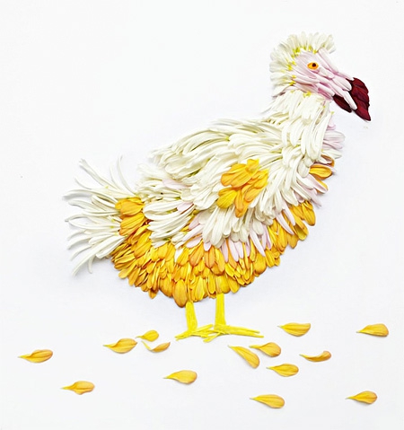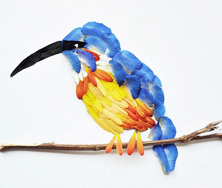 Malezyalı sanatçı Hong Yi, rengarenk çiçek yapraklarını farklı şekillerde aranje ederek kuş portreleri yaratmış ve böylece tüylere gerçekçilik katmış.