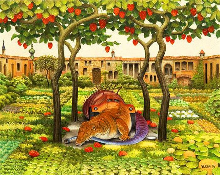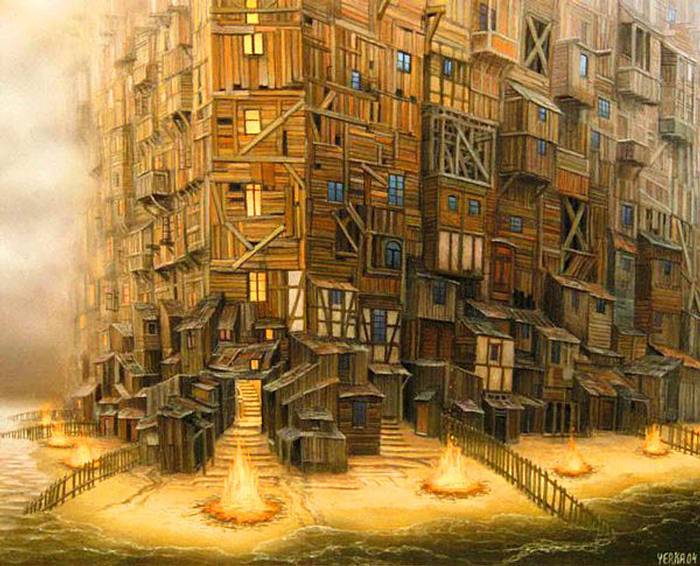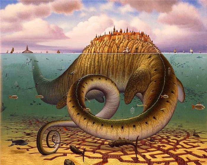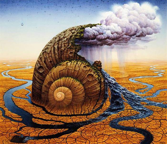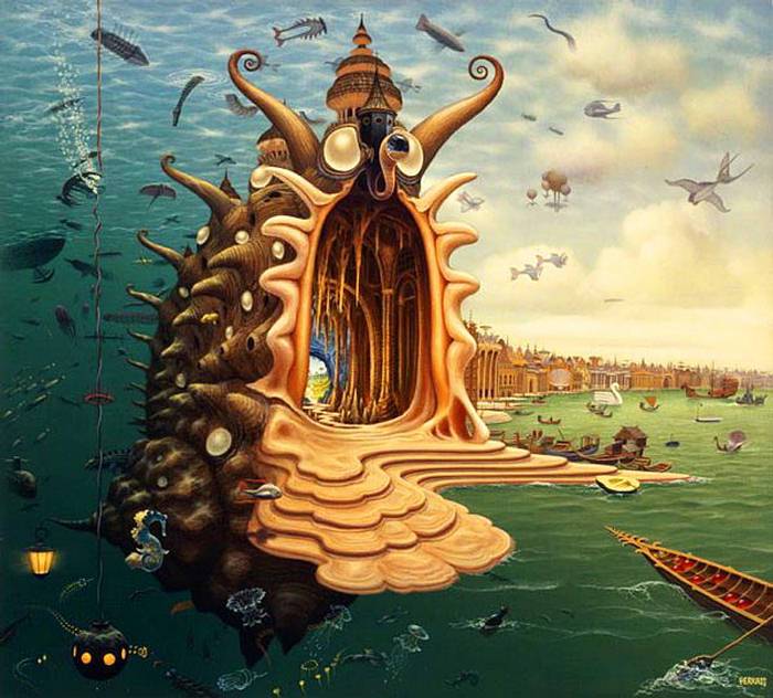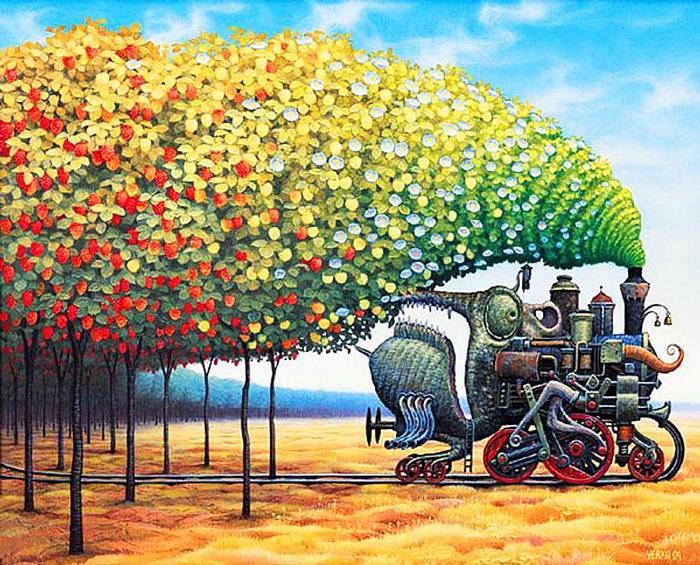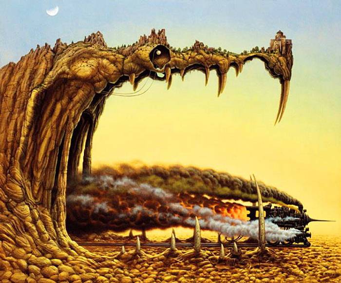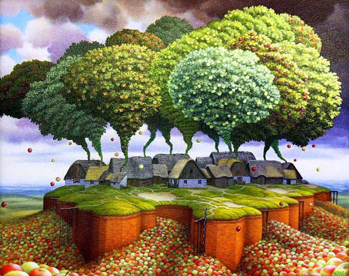 Jacek Yerka, çocukluğumuzun hayal dünyasının mekanları ve manzaraları ile 1950 tekniğini birleştirerek harika çalışmalar elde etmiş...