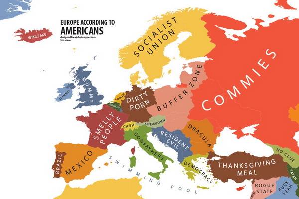 Bu haritada Türkiye "Şükran Günü yemeği" olarak tanımlanmış (İngilizce'de Turkey kelimesinin hindi anlamına gelmesinden, ve hindinin bu güne ait geleneksel yemek olmasından ötürü).