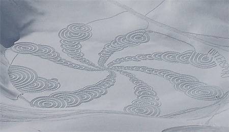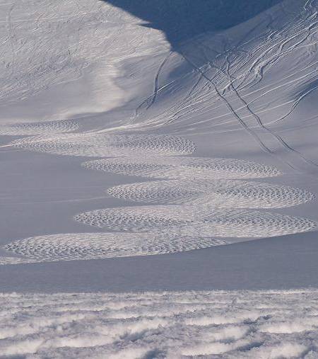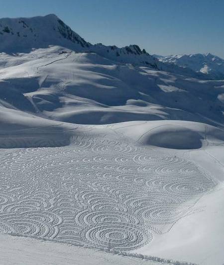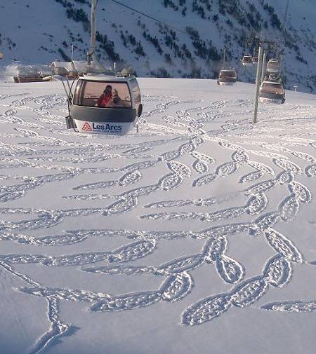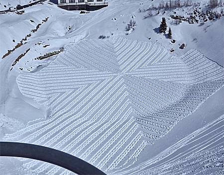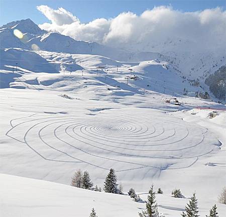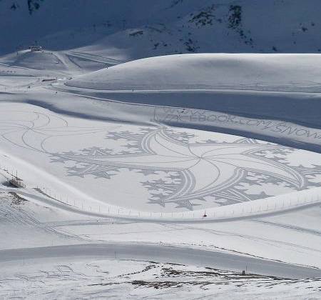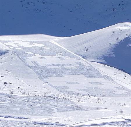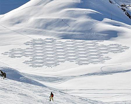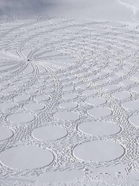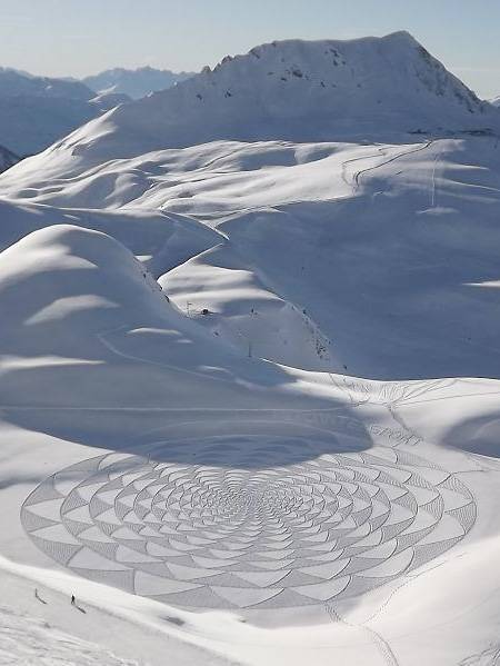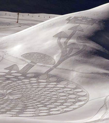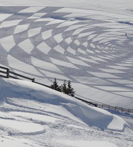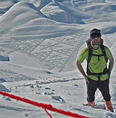 Her bir deseni yapmak için 10 saatini harcayan sanatçı kayak merkezlerindeki tepelere kar ayakkabılarının yardımıyla büyük şekiller çiziyor.