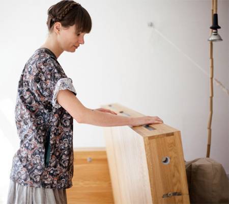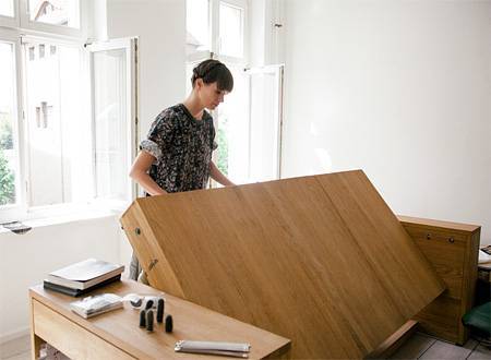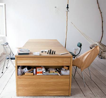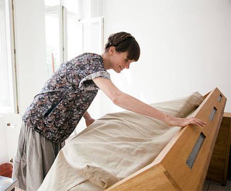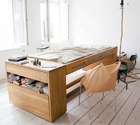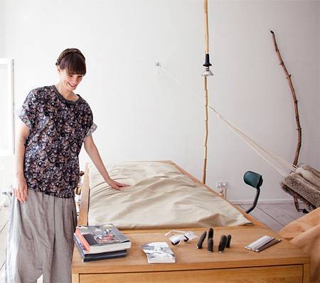 Ahşaptan yapılmış çalışma masası kendi etrafında döndürüldüğünde rahat bir yatağa dönüşüyor.