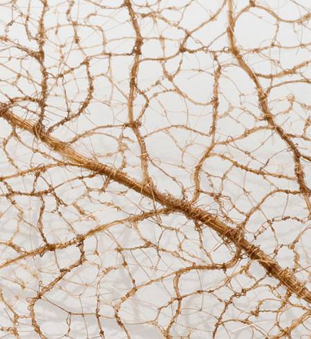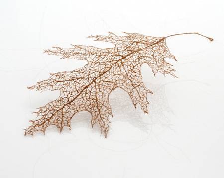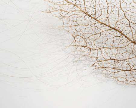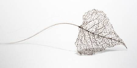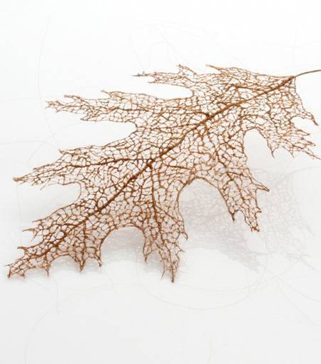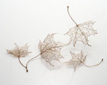 Saç tellerini dikme ve düğümleme yöntemleriyle birbirine bağlayarak karmaşık yaprak damarlarını oluşturan Jenine Shereos, son derece ayrıntılı olan bu ağ kümesini doğada ki yaprakların desenlerini taklit ederek oluşturmuştur.