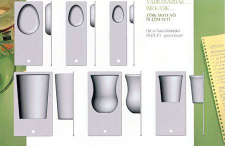 Lale Taneri'nin bu çalışması yemek yapanların işlerini kolaylaştıracak cinsten. Çünkü yemek tariflerinde bahsi geçen yarım bardak veya çay kaşığı, tatlı kaşığı tanımlamaları hep kafa karıştırır. Malum her evdeki çay kaşığı ya da bardak aynı boyutta değil. İşte bu kafa karışıklığına çözüm ve standart getirecek cinsten bir tasarım bu.