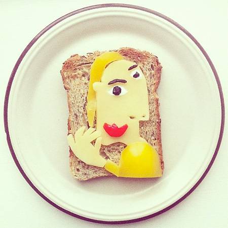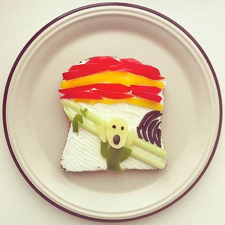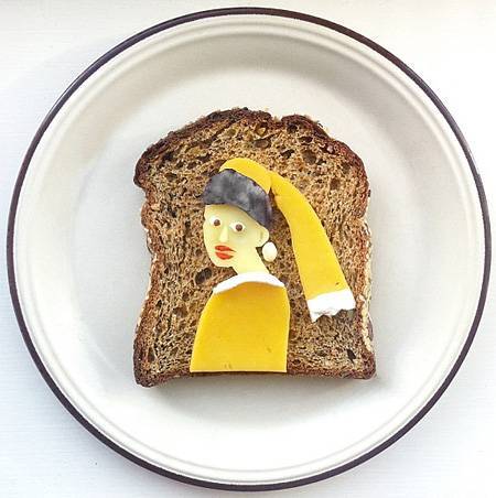 Kızarmış ekmek, sebze ve meyvelerle hazırladığı çalışmaların arasında ünlü sanat eserleri de bulunuyor.