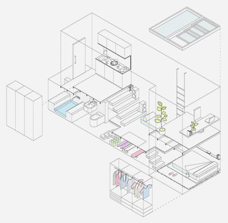 İspanya'nın Madrid şehrinde bulunan MYCC firması mimarları tarafından tasarlanan modern stüdyo daire, küçük bir alanda rahat bir yaşam imkanı sağlıyor.