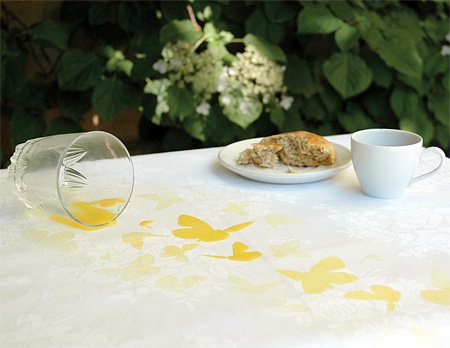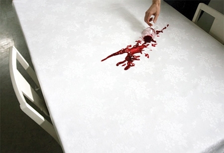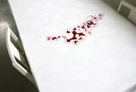 Kristine Bjaadal tarafından tasarlanan bu masa örtüsü, üzerine kaza ile dökülen sıvıları bir sanat eserine dönüştürüyor.