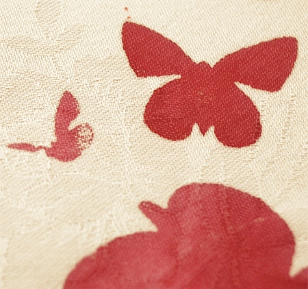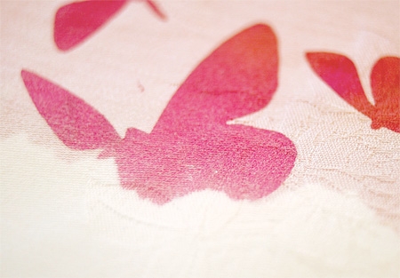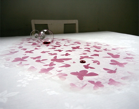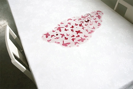 Resimlerdeki örneklerde masa örtüsüne gizlenmiş kelebek desenleri, ıslandığında gün yüzüne çıkıyor.