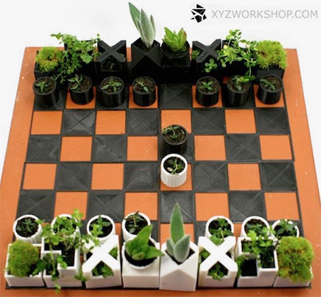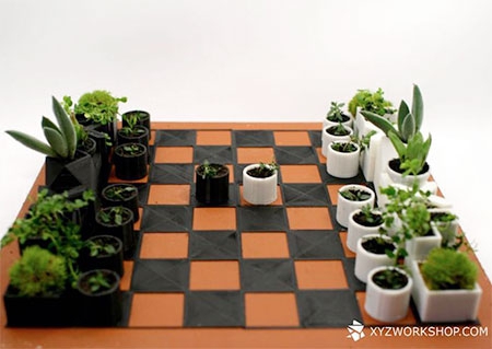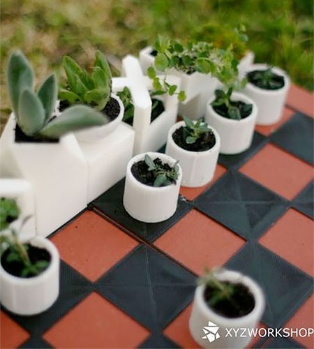 Yeşil ve satrancın birleşimi 3D yazıcıdan çıkarılarak elde edilen minik saksılara, istediğiniz bitkiyi ekerek ilginç bir satranç seti yaratabilirsiniz.