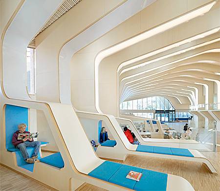 Kütüphanenin büyük pencereleri sayesinde içeri giren bol ışık, rahat bir okuma olanağı sunuyor.
