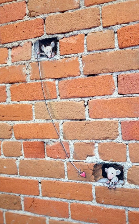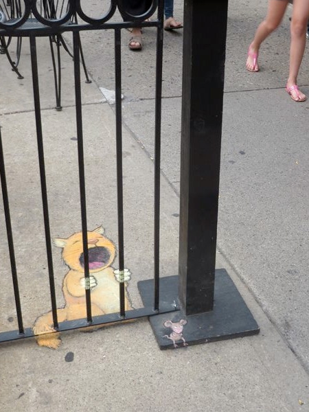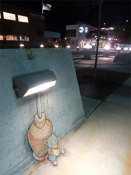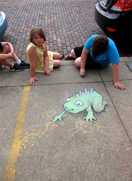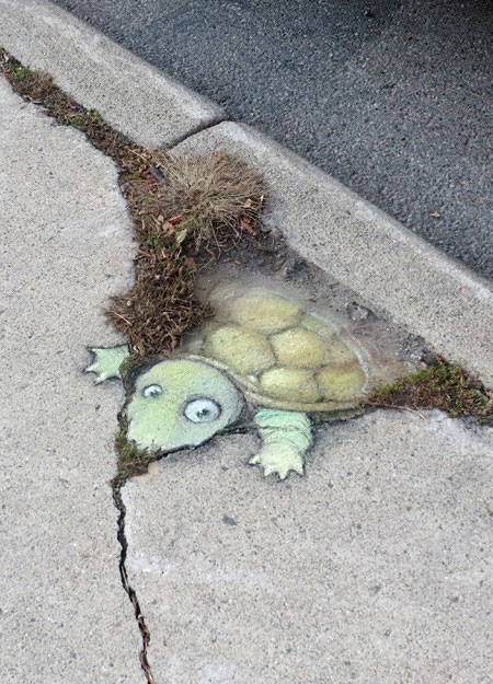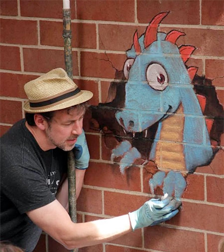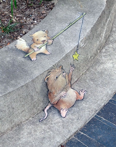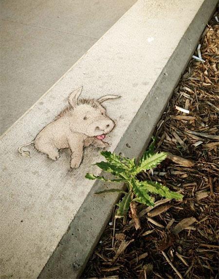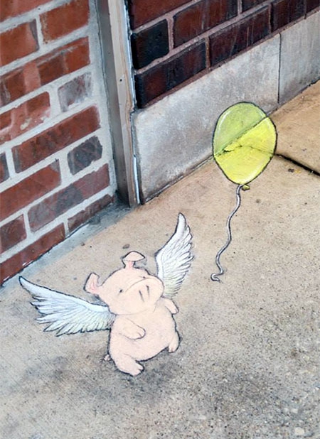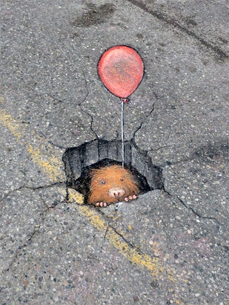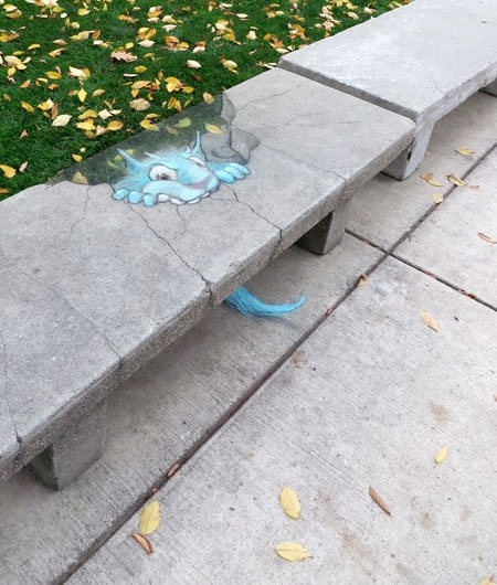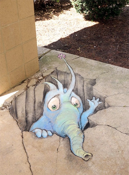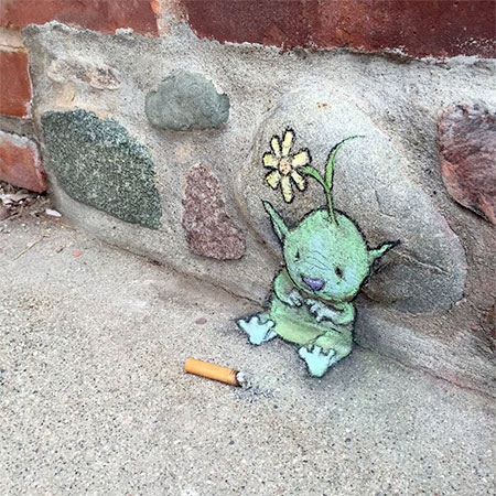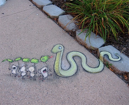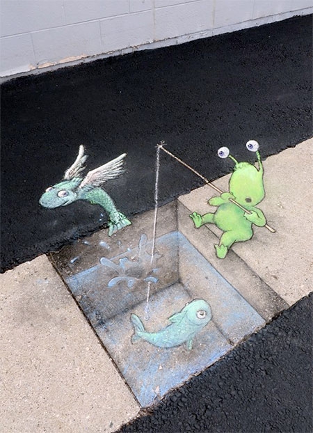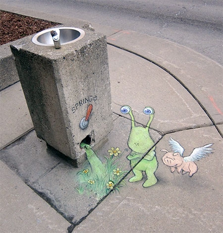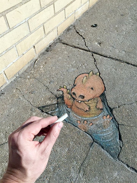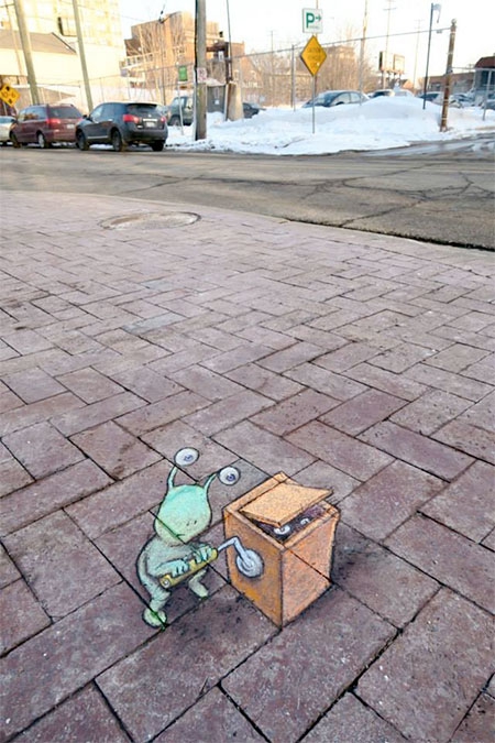 Amerikalı sanatçı David Zinn tebeşiriyle kaldırımları, duvarları ve yolları üç boytlu olarak çizdiği sevimli karakterlerle süslüyor.