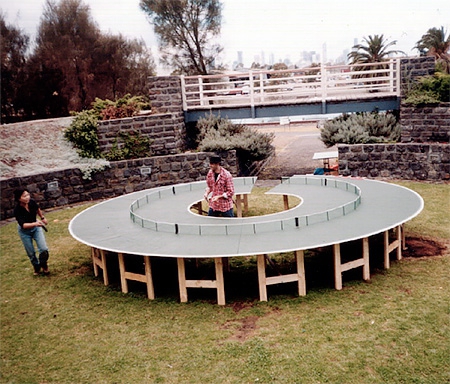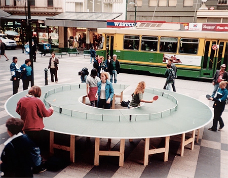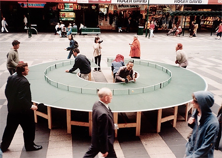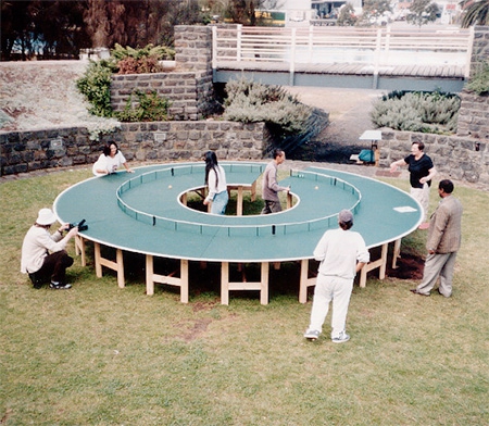 Singapur'lu sanatçı Lee Wen tarafından dizayn edilen yuvarlak tenis masası, aynı anda birden fazla maç yapılmasına imkan sağlıyor.