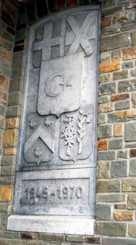 Fotoğrafta Faymonville belediye binası girişinde bulunan taş oyma Türk bayrağı görünüyor