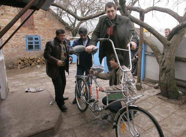 Ukrayna'da yaşayan Dünyanın en uzun adamına bir mühendis tarafından dünyanın en büyük bisikleti hediye edildi. 2m 57cm olan adamın bisikletide sıradışı.
