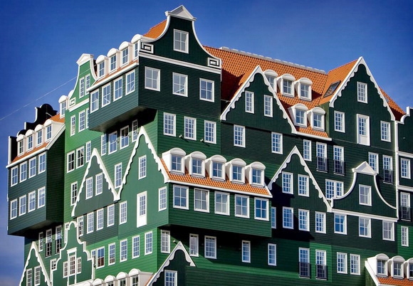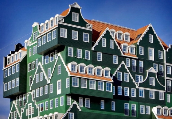 Bu enteresan otelde sanki geleneksel Hollanda mimarisine sahip küçük evler, birbirinin üstüne bindirilmiş gibi...